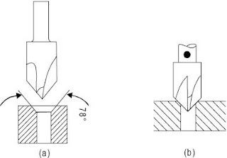 Flat drill is usually made from a piece of round steel which is forged to shape and ground to size, then hardened and tempered. The cutting angle is usually 90 deg. and the relief or clearance at the cutting edge is 3 to 8 deg. The disadvantage of this type of drill is that each time the drill is ground the diameter is reduced. Twist drill is the most common type of drill in use today. The various types of twist drills (parallel shank type and Morse taper shank type) are shown in Fig. 3